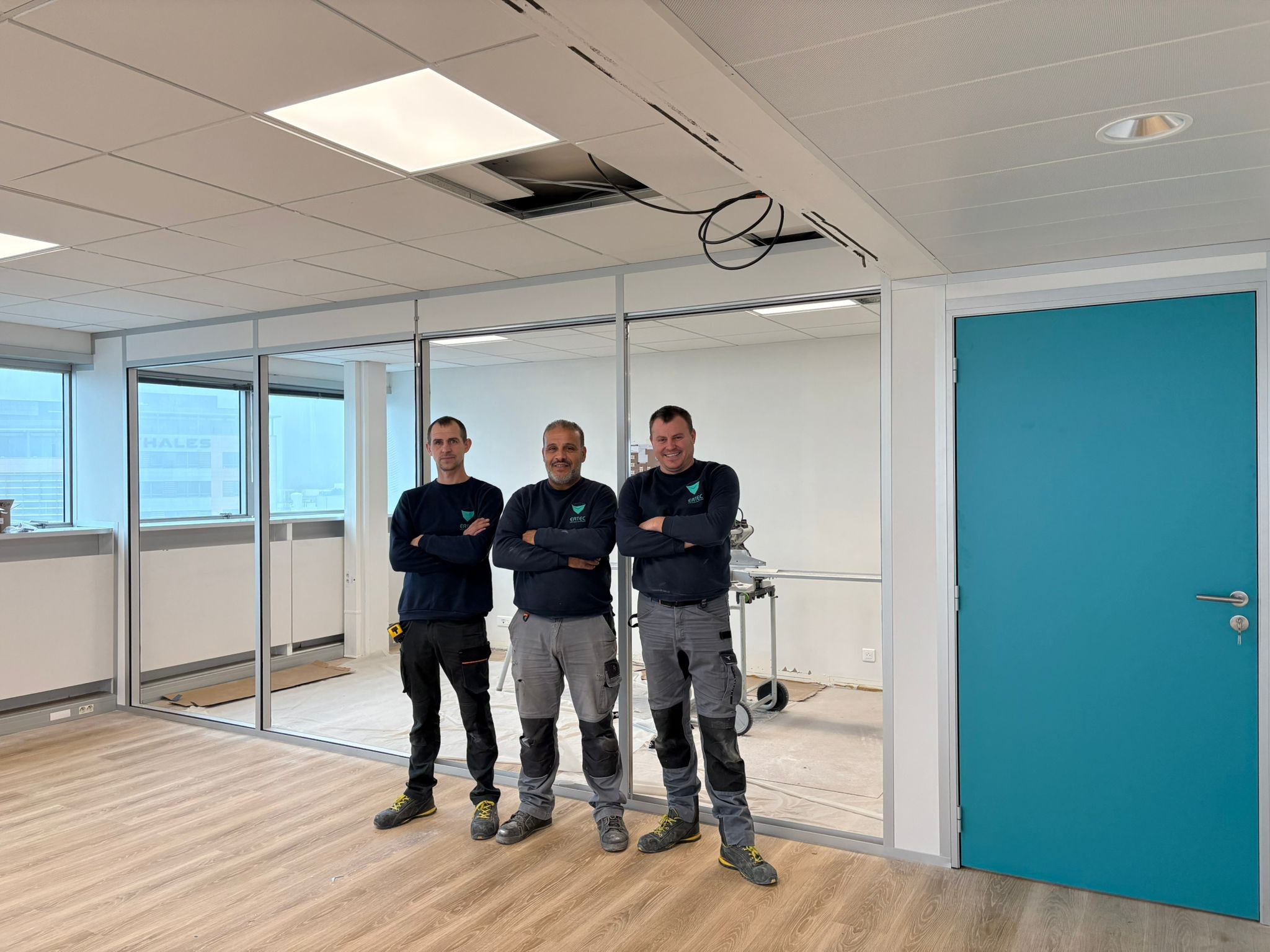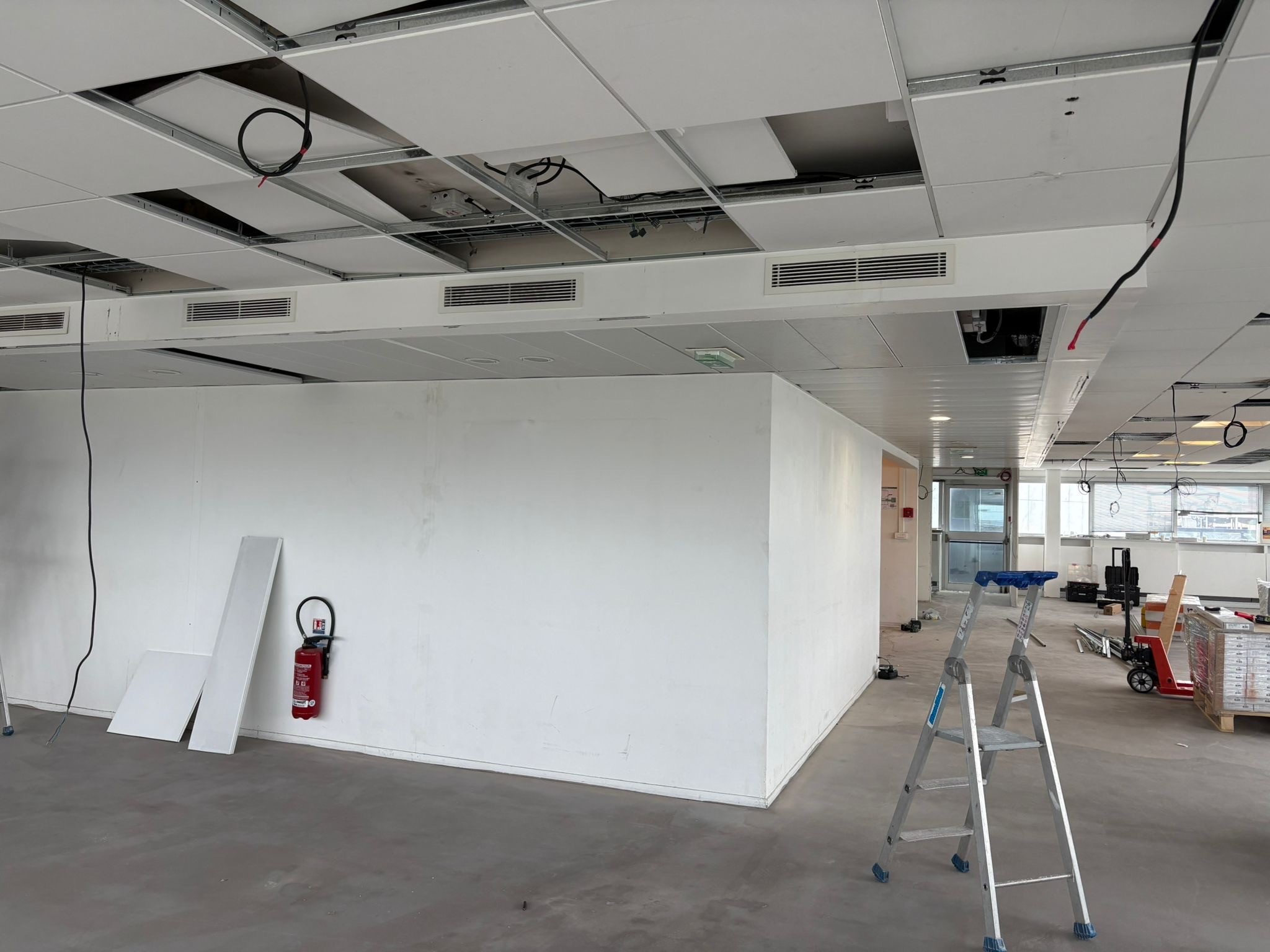 Cloisonnement, faux-plafonds, courant fort, courant faible, sol, peinture, mobilier tout a été coordonné pour terminer le projet en moins de 6 semaines.